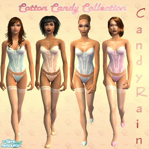 A collection of cotton candy colored corsets with matching panties and stiletto pumps.