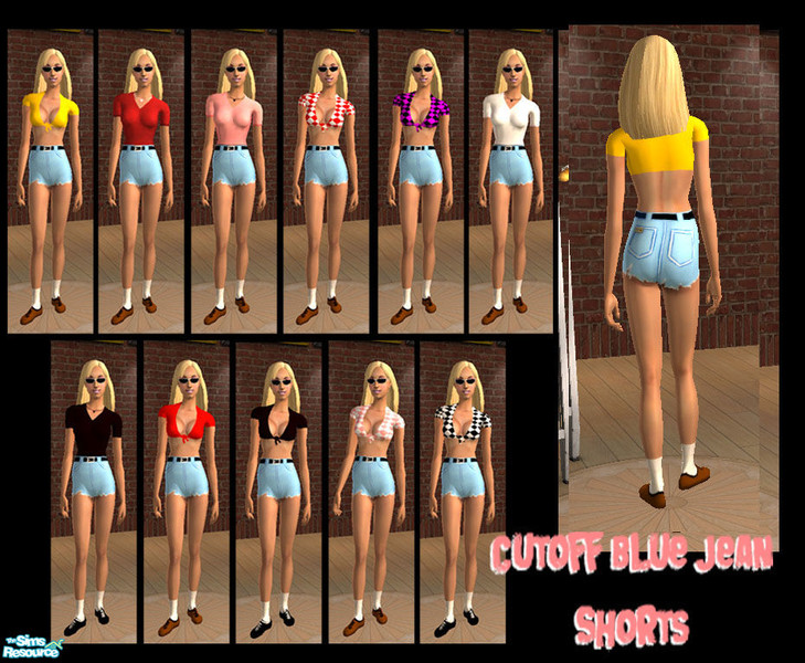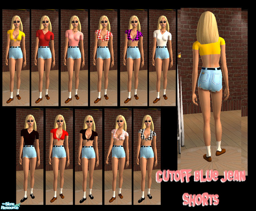 Cutoff jean shorts. I changed the alpha to make these shorter and make the appearance of rips. Different tops go with these. This is a one piece.