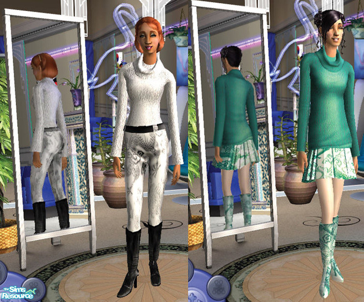 Warm turtlr nrck sweaters paired with dragon print bottums. This set is the result of falling in love with meshes from Sims2sisterz, Lianaa, and a print from the fat strawberry.