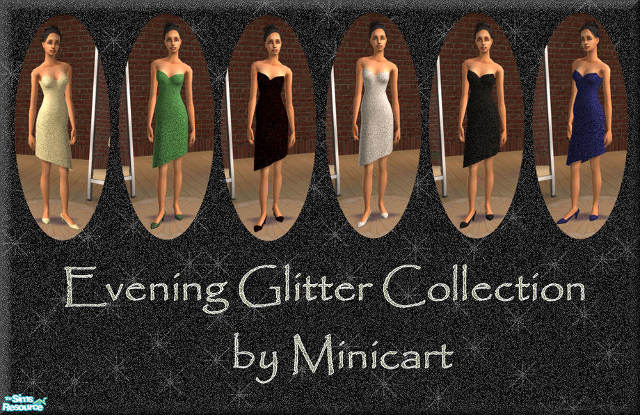 Six lovely glitter dresses in red, silver, blue, green, gold and black.
