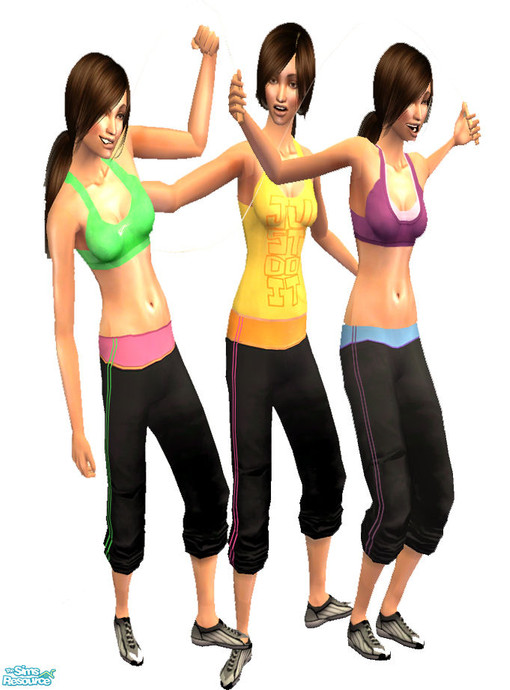 A set of workout clothes for your female adult sims. The set uses confide\'s mesh and you must get the mesh for these recolors to work.