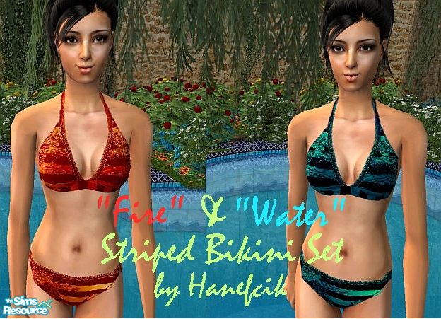 The unique colours and shades of these two swiming suits resemble two main live elements: Fire and Water. Let your Sim lady feel the power of them! This elegant halter bikini was designed for adult female only. Have fun!