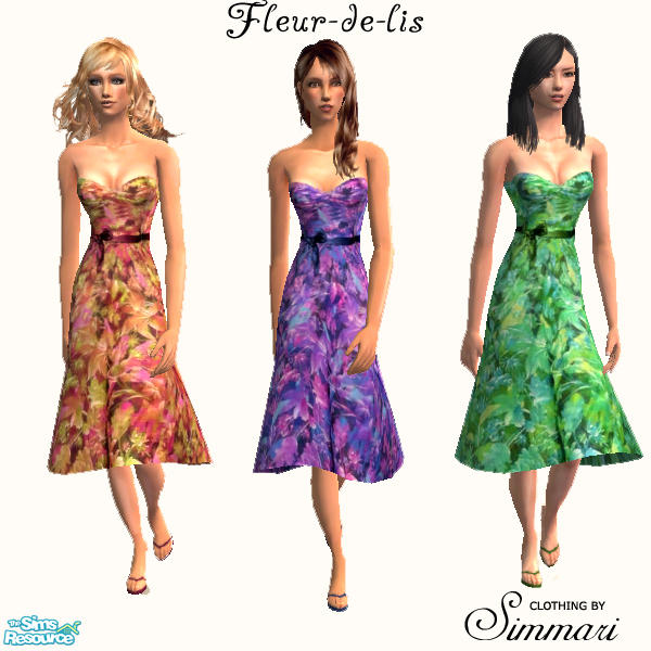 Lovely dresses with a lily-pattern. Matching ribbon around the waist. *** requires "MESH_SimChicTeaDress3-16-05" from Sim Chic. See installation instructions.
