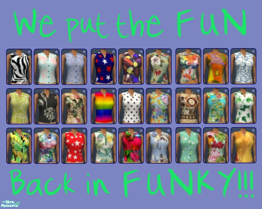 The 2nd part of my set of VERY different fun funky print shirts for your sims who like to be unique. No mesh needed.
