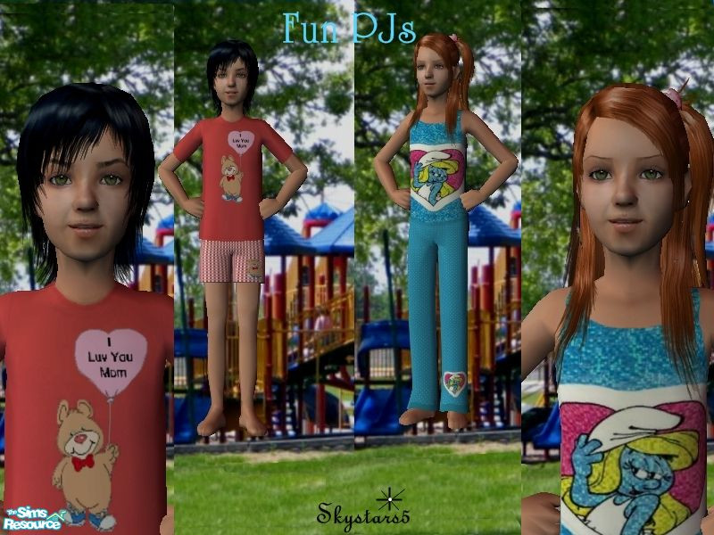 Cute PJ's for your girl and boy Sims. The little boy's PJ's has a bear holding a heart shaped balloon that says, "I love You Mom". The little girls PJ's has a cute picture of Smurfette inside of a white heart on the front and pants leg.