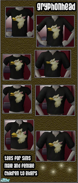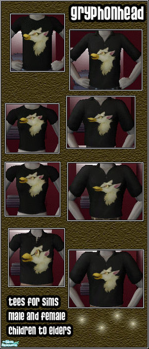 A collection of gryphon portrait t-shirts for the casual fantasy Sims. Available for male and female, all ages from child to elder. Adult tees will also work for college Sims if you have the University EP.