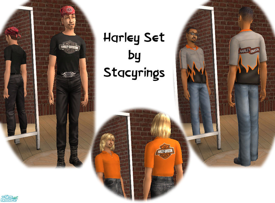 Here's a set for your adult males. Two full outfits and one shirt with authentic Harley-Davidson logos. Flame shirt requires Nightlife. No mesh needed.