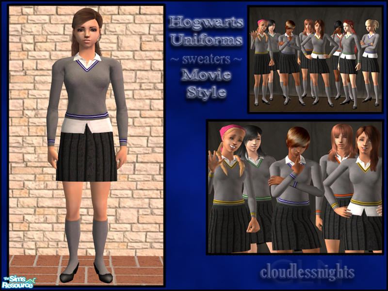 Hogwarts uniforms for adult and young adult females, based on those seen in the Harry Potter movies. This set includes four sweaters in the four house colours. Mesh is included in the set.