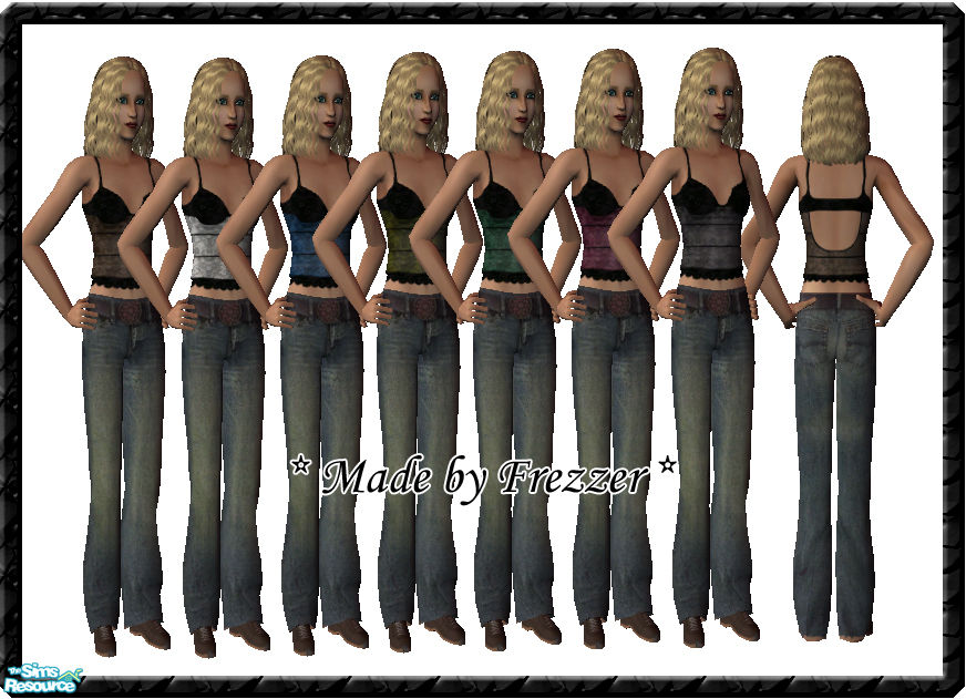 A set of beautiful lace tops in black, white, chocolate, ruby, jade, lemon and marine. Perfect when your sim girl wants to be a little glamorous without getting formal.