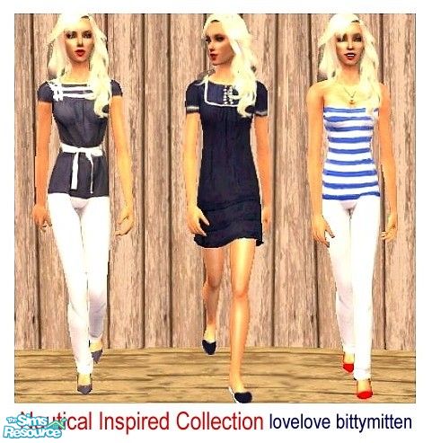 A collection of 3 sailor style outfits for adult females. You will need female mesh 11 from glamorous lounge. It is the second mesh on the third page.