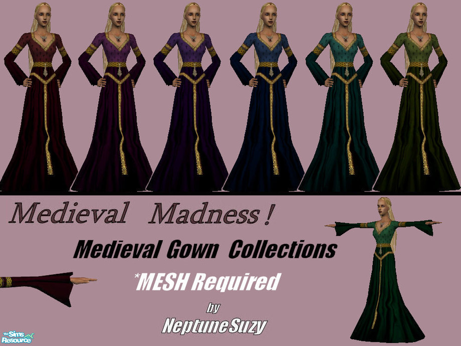 Your sims will love these Medieval Gowns with their flowing skirts and wide sleeves! ***Requires my mesh, MESH_NSC_Gown050629, Available here at TSR. Enjoy!
