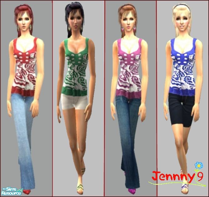 4 outfits with the same top in 4 different colours - pink, green, blue and red. For female adult sims. Enjoy :)