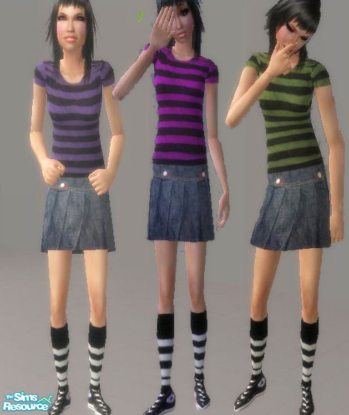 3 teen outfits. each contains a pleated denim skirt a pair of black chucks and a stripey shirt. in 3 different colours. No mesh needed. first time making chucks...feedback would be appreciated. I hope you enjoy!!!!