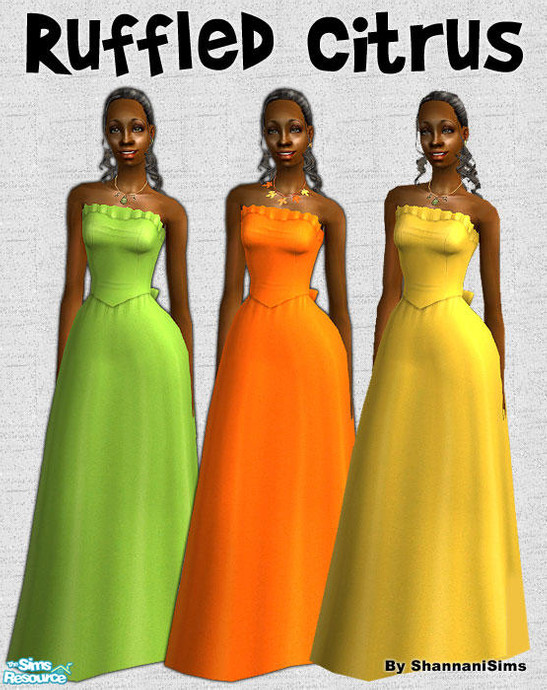 Bright Citrus Colored Gowns with Ruffles and Bow. Requires my "Couture Gown" body mesh to work in your game.