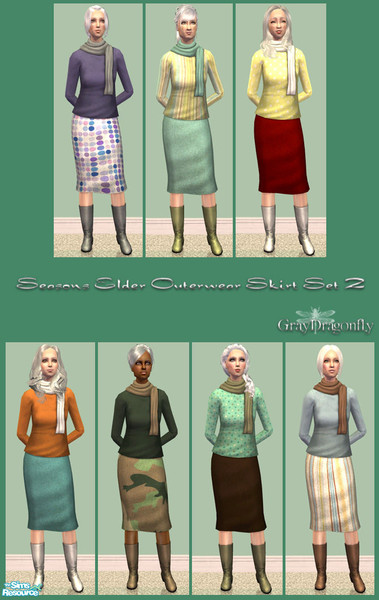Second part of a two part set. This set includes 7 recolors of the Seasons Elder Outerwear Skirt for female elders.