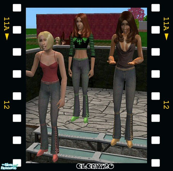 The remake and recolors of these blue jeans with colored stitching and matching colored belts around the waist, for young adult females/females. Colors included: pink, brown, green, blue, and purple.