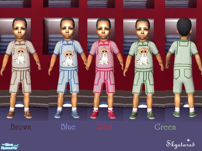 A set of four colorful striped coveralls in Brown, Blue, Red, and Green for your little boy toddlers. They are embroidered with a cute puppy on the front bib area.