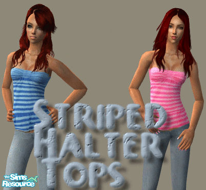 A set of two Striped Halter Tops. They come in blue and bubblegum. Both use mesh MESH_AF_T_UntuckableTop.rar by HystericalParoxysm. Enjoy.