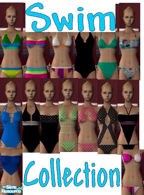A collection of 15 different swimsuits and binkinis ready for the summer. In bright, or dark, colours.