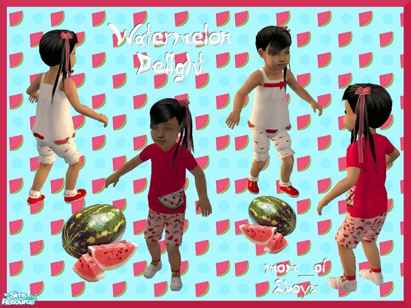 Two new sets for Toddler Girls. Set 1 is a red tshirt with a watermelon slice on one side with watermelon patterned shorts, and watermelons on the top of the sneakers. Set 2 is a white sleeveless top with watermelons around the scalloped bottom of the top, on the shorts and around the edge of the socks.
