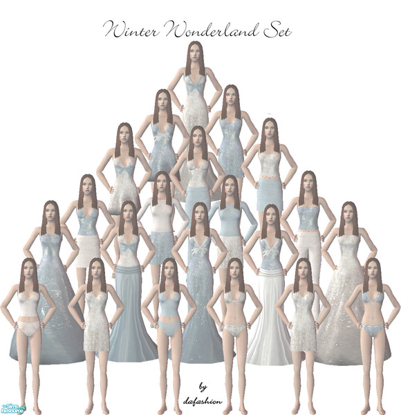 Winter Wonderland is a 28 piece set of Ivory and Ice Blue including formal, casual, swim, lingerie, and Pj's.This set is designed to mix and match with two of my earlier sets: the Sequin, Satin & Angora set and the Wentworth 2005 set.