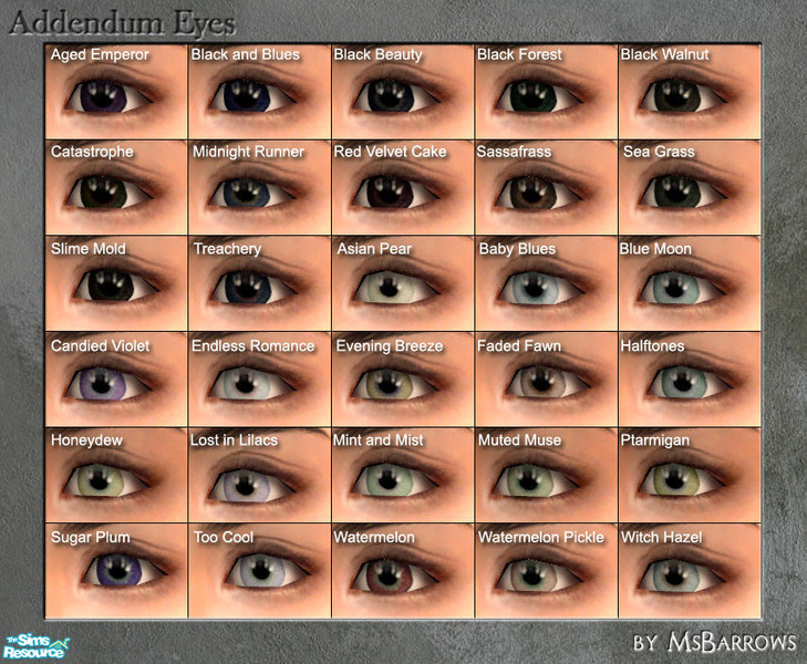 MsBarrows\' Addendum Eyes set. This set has been geneticised and altered to be usable by the game when creating townies and NPC\'s. This will not affect existing characters, only new ones generated after this set is installed.