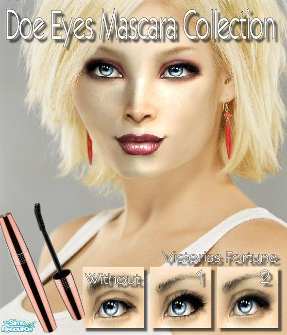 Here are two new mascaras that will open up and brighten any sims eyes. They will give you\'re favorite sim that sweet \"Doe Eye\" look. Doe Eyes 1 has a darker liner with a more defined look, while Doe Eyes 2 has a subtle, more natural look.