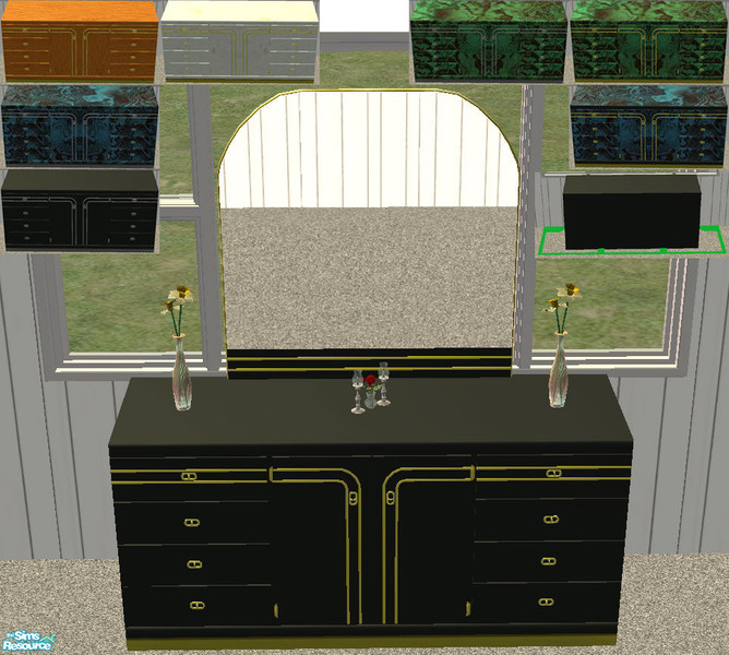 3 tiles wide w/ 3 surface slots for object placement. Designed to go with my Ashley Cataline Mirror. Includes default onyx gold and 11 recolors. Onyx silver; lapis, malachite, quartz, and wood with gold accents; lapis and malachite with silver accents. Light wood inside drawer. Mirror NOT included.