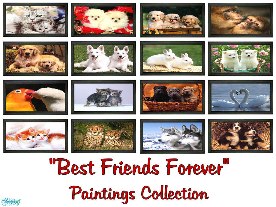 This is a set of paintings inspired by the new \'Best Friends Forever\' relationship. Included are 16 paintings of cats, kittens, dogs, puppies, birds, rabbits, and more, all portraying that special quality of friendship. These are re-colours of the \'Poisonous Forest\' painting with a black frame.
