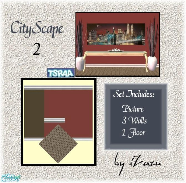 City Scape 2 Set includes 1 Picture, 2 walls, 1 floors. Walls can be found in paint section and floors in carpet. Picture is found under the Cantankerous Splatters painting. Enjoy! by iZazu..