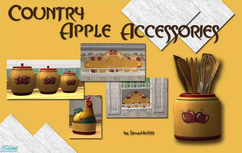Country kitchen accessories in warm honey tones and painted, red apples.