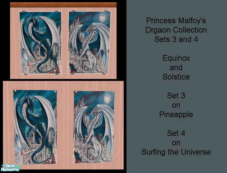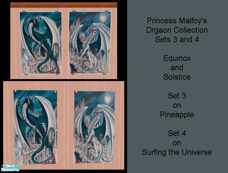 Princess Malfoy\'s Dragon\'s Collections 3 and 4. Collection three is Equinox and Solstice on Pineapple (Nightlife). Collection four is Equinox and Solstice on Surfing the Universe (University). Look for more Dragons in the future.