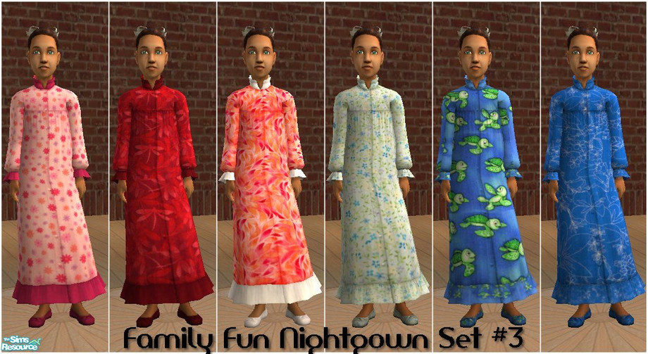 A set of recolors for the Family Fun Stuff girl's nightgown in fun patterns and bold colors.
