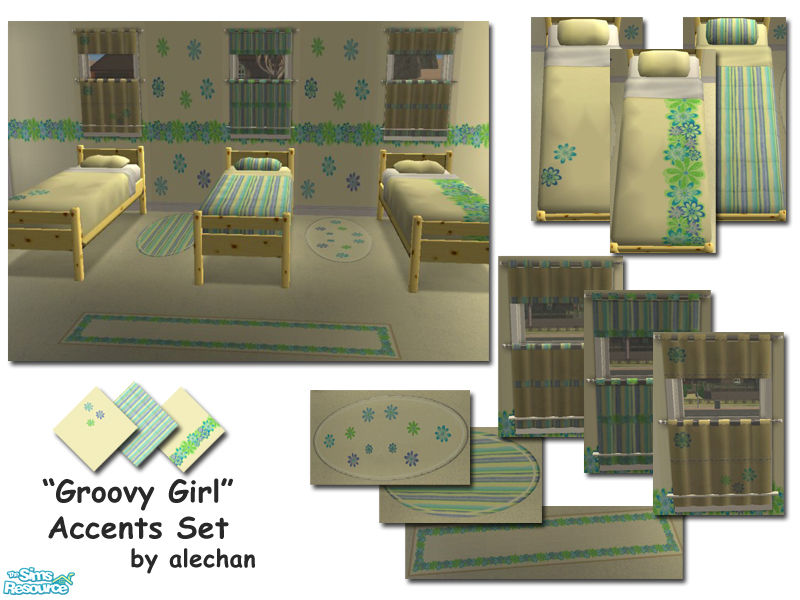 Set of 3 covers, 3 rugs and 3 curtains recolors to match with my \"Groovy Girl\" walls and floors sets. Nightlife EP required for rugs only. Walls and Floors not Included