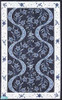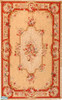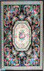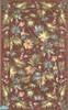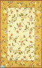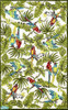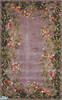 Eight antique rugs in various flora and fauna patterns including vines, flowers, ribbons, parrots, and leaves. Colors include: lavender or purple, honey yellow, dark blue, dark green, blue and white, mauve, and orangey peach. From Laura Simly Designs.