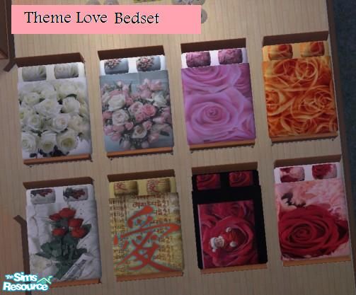 A nice bedset with the theme Love. The set has 8 items; \"White Beauty\", \"Blossom Beauty\", \"Little Santa Rose\", \"Love\", \"Orange Roses\", \"Weddingbouguet\", \"Pink Passion\" and \"Music Roses & Champagne\". Enjoy!