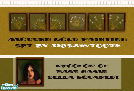 Striking Gold and Green paintings that even your male sims will enjoy! Recolors of the original maxis base game wall hanging Bella Squared. Matches my Mod Gold bedding, curtains, walls and floors.