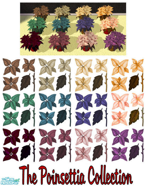 A poinsettia is no longer just for Christmas - now you can have them all year round to brighten up your Sims\' homes! Available in 12 conventional (and unconventional) colours, they can be placed on tables or floors. These are re-colours of the flowers/leaves only, and can be used with any of the pots.