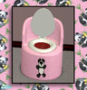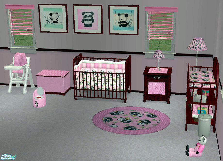 This adorable pink nursery features cute little Panda Bears. The Set includes Crib Sheets, Crib Frame, Changing Table, High Chair, Teddy Bear, Potty Chair, End Table, Table and Floor Lamps, Area Rug, 3 Pictures, Wallpaper and Carpet