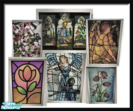Here's a set of 6 beautiful stained glass paintings for your Sims home-uses two Maxis meshes..."The lady in Red" and "Two dogs and an Olive". Hope you enjoy them in your homes!