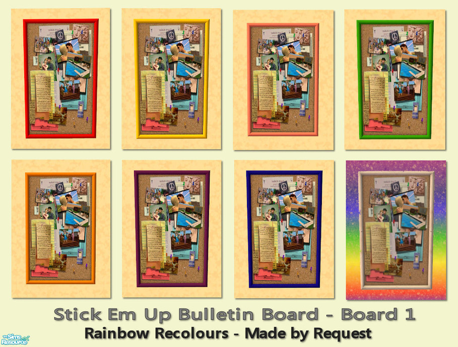 A fun collection of bright rainbow recolours of the 'Stick Em Up Bulletin Notice Board', and are recolours of the lighter framed board (board 1). The colours match all of the other Rainbow Sets of fun objects and furniture. These only require one (any) expansion pack to work. Made by request.