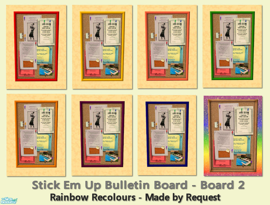 A fun collection of bright rainbow recolours of the 'Stick Em Up Bulletin Notice Board', and are recolours of the darker framed board (board 2). The colours match all of the other Rainbow Sets of fun objects and furniture. These only require one (any) expansion pack to work. Made by request.