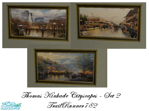 Thomas Kinkade is one of the most talented and famous living American artists. Known for the way he paints light, his paintings match the light of day. This set consists of 3 cityscape paintings: Boston, Main Street Celebration, and Mountain Memories. Recolor of Rolling Hills, a maxis mesh with the base game. :)