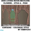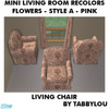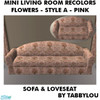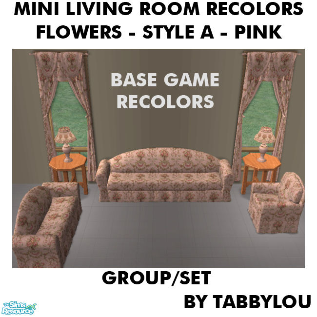 Flowers (Style A) Motif in Pink recolors of the Base Game Sofa (plus Loveseat), Chair, Curtains, & Lamp Shade & Base for your Mini Living Pleasure. Mix & Match with any furniture sets you like. Enjoy!