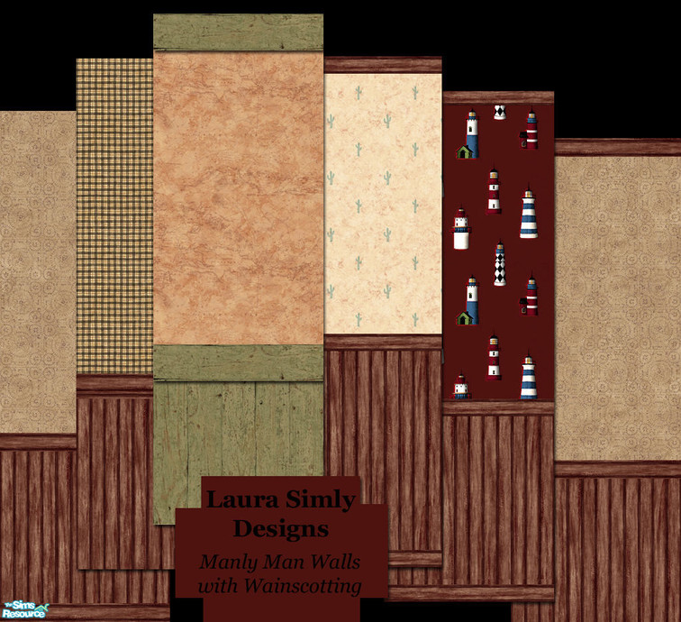 Here are six Manly Man walls in shades of red and with distressed wood wainscoting accents. Set includes: two tin punch variations, tiny plaid, maps and charts, cacti, and lighthouses. From Laura Simly Designs.