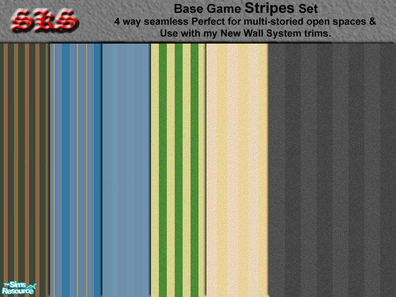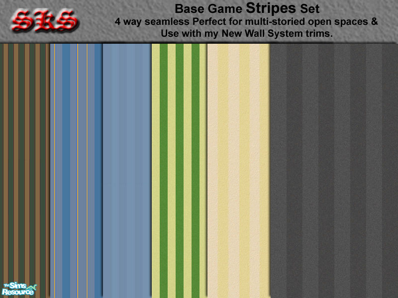 These 6 striped wallpapers were taken from Base Game, now made 4 way seamless. Perfect for multi-storied walls & use with NewWall trims. Zip includes an optional override file that removes the original wall coverings from your catalog, but not the game. By: SKS
