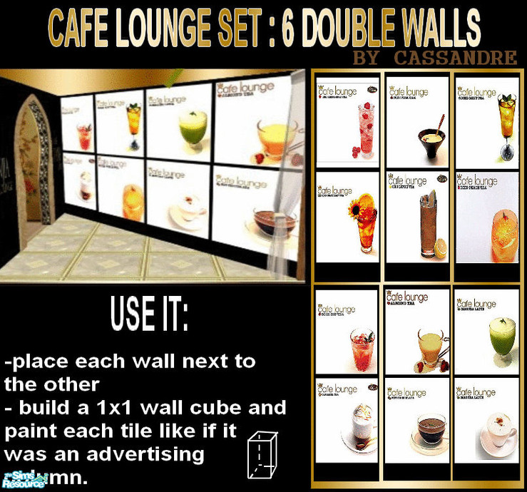 A set of 6 wallpapers, perfect for your restaurant and cafe shop!Follow the installation instructions,and give your community lot the extra detail that\'ll make the difference!