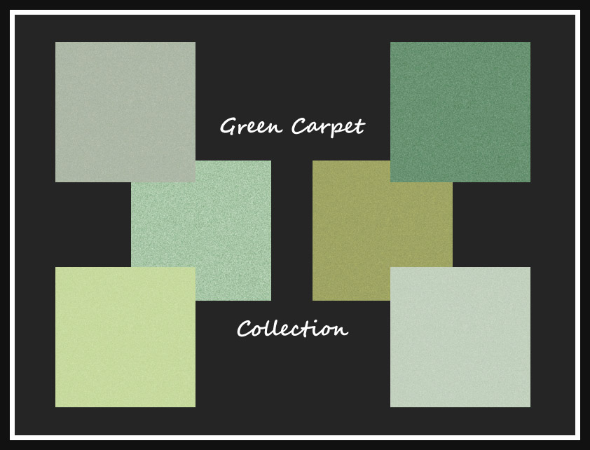 A collection of six carpets in shades of green.