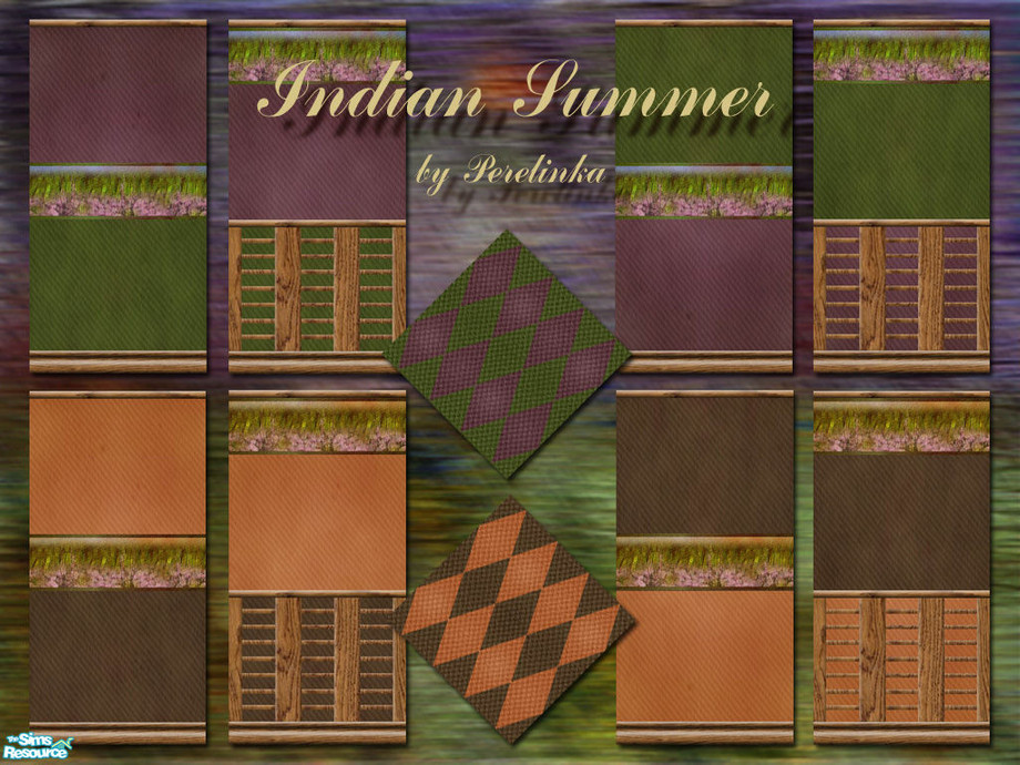 Sims 2 — Indian Summer Set by perelinka — Wallpapers in plum+green and orange+brown finished with oak wood.