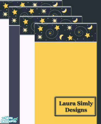 Celestial border of stars, moons, and swirls on a dark blue background. Matched with four base colors: dark blue, light blue, gold, and white. From Laura Simly Designs.